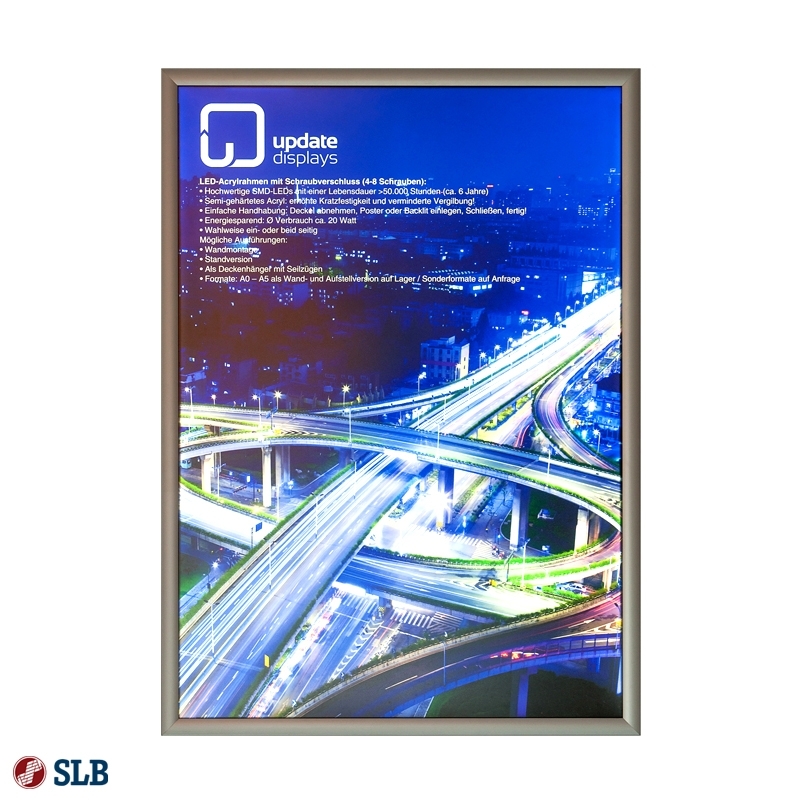 Leuchtrahmen mit sehr geringer Bautiefe. 25 mm Klemmprofile bei den einseitigen Klapprahmen und 35 mm Klemmprofile bei den doppelseitigen Klappahmen, silber eloxiert. Mit Ein- und Ausschalter am Rahmen, steckbarem Netzteil und integrieter Seil-Abhängung für Hochformat- Anwendung bei doppelseitiger Anwendung. Sonderformate auf Anfrage möglich. Zur Beleuchtung werden hochqualitative Marken-LED’s verwendet! Doppelseitige Ausführung auch als spezieller Immobilien-Rahmen erhältlich!